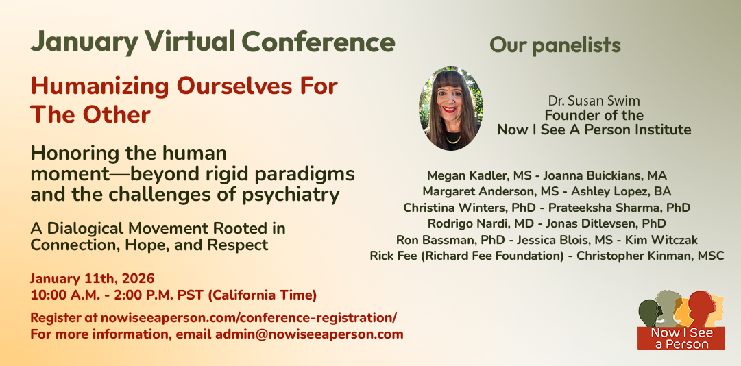 For over four decades, the Now I See A Person Institute has advanced research, education, supervision, and clinical care in Collaborative Dialogical Practices. Founded by Dr. Susan Swim, PhD, LMFT, our work is rooted in the dis-diseasing of mental healthโmoving beyond medicalized labels to listen deeply, honor lived experiences, and co-create healing through human connection. Our institute trains clinicians worldwide, supervises the next generation of systemic practitioners, and conducts research documenting recovery and transformation without coercion or over-medicalization.